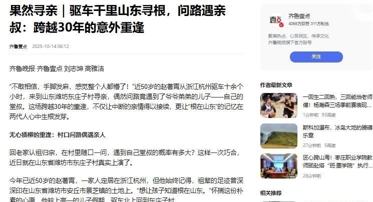 果然寻亲|驱车千里山东寻根,问路遇亲叔:跨越30年的意外重逢.齐鲁壹点.2025-10-14